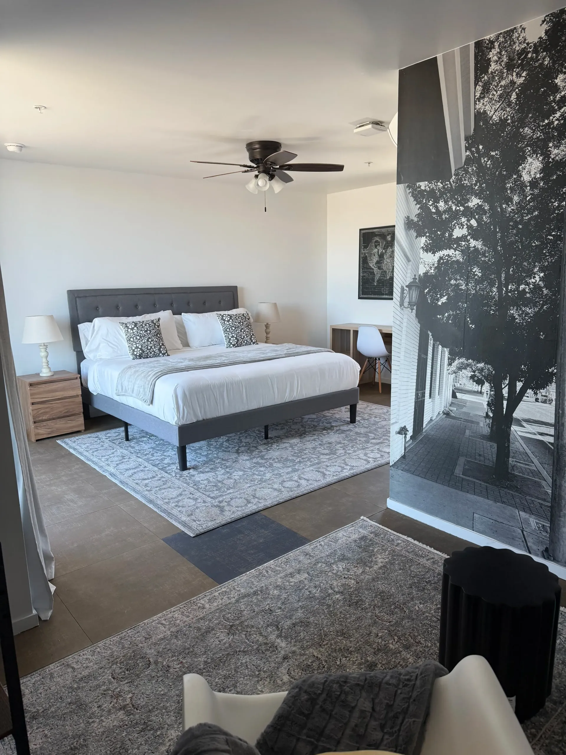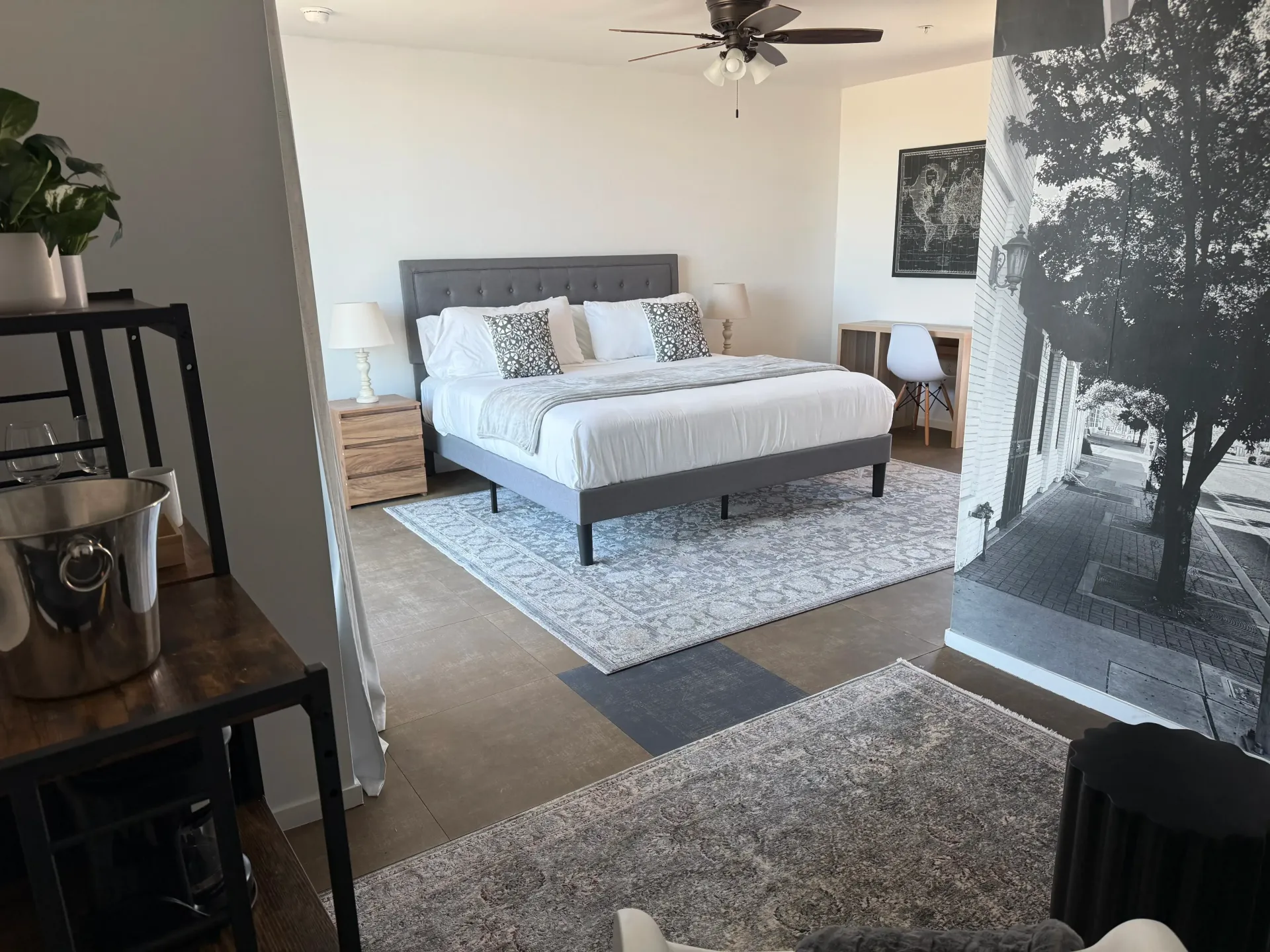 Designed for couples, solo travelers, or the digital nomad, our King Suite focuses on high-quality rest. Featuring premium linens, a dedicated workspace, and plenty of natural light, it’s a "clean and happy" sanctuary to return to after a day of desert exploration. Simple, stylish, and perfectly curated.